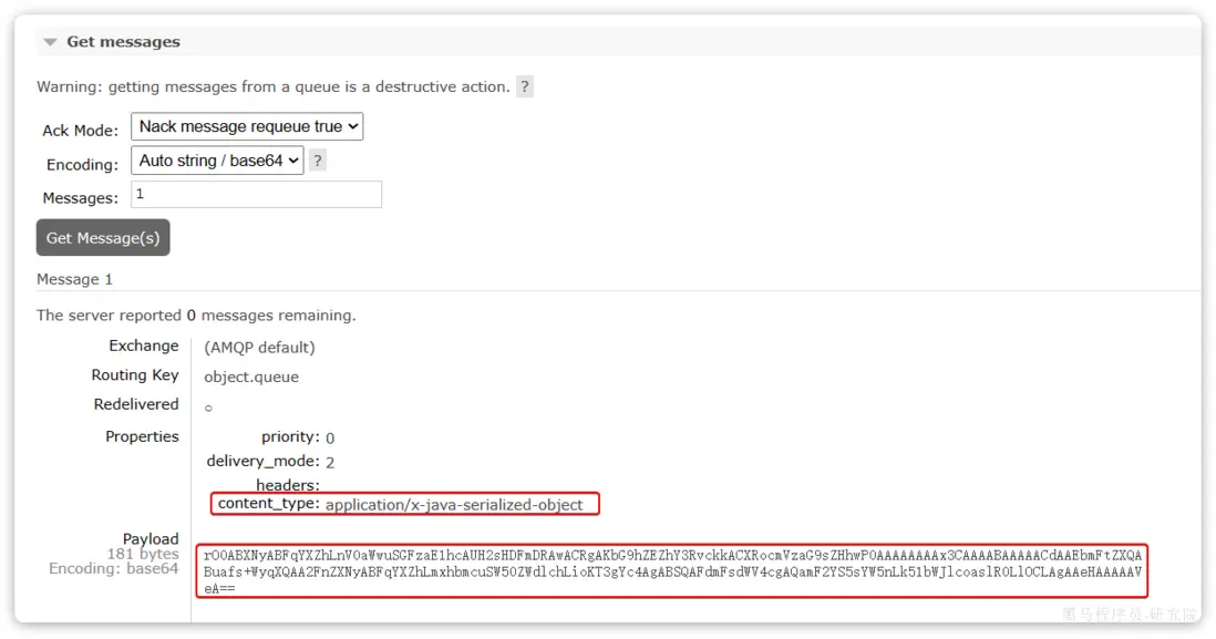 此時,我們到MQ控制枱刪除object.queue中的舊的消息。然後再次執行剛才的消息發送的代碼,到MQ的控制枱查看消息結構: