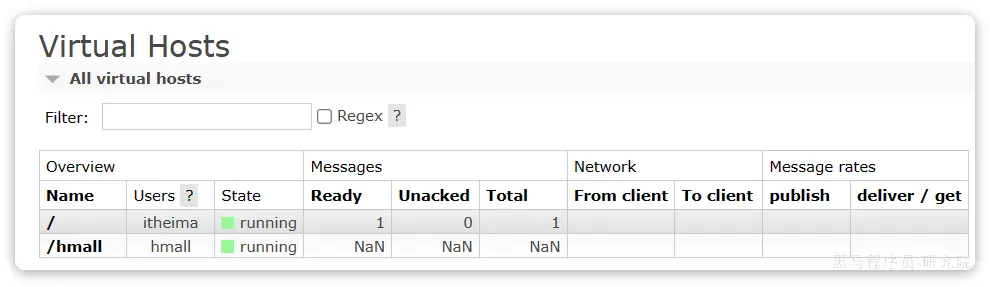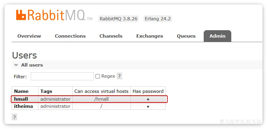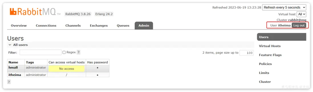由於是登錄hmall賬户後創建的virtual host,因此回到users菜單,你會發現當前用户已經具備了對/hmall這個virtual host的訪問權限了: