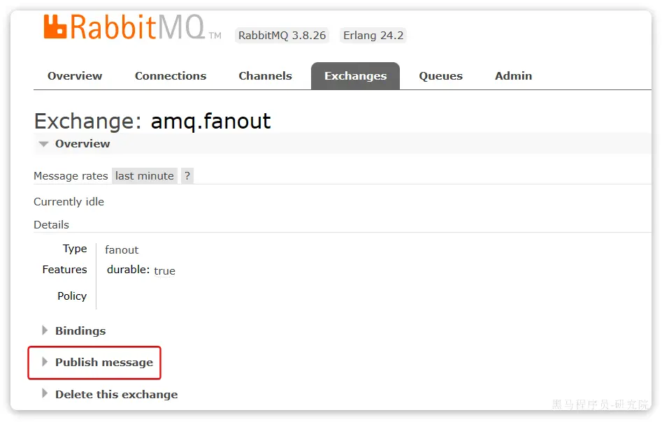 再次回到exchange頁面,找到剛剛綁定的amq.fanout,點擊進入詳情頁,再次發送一條消息: