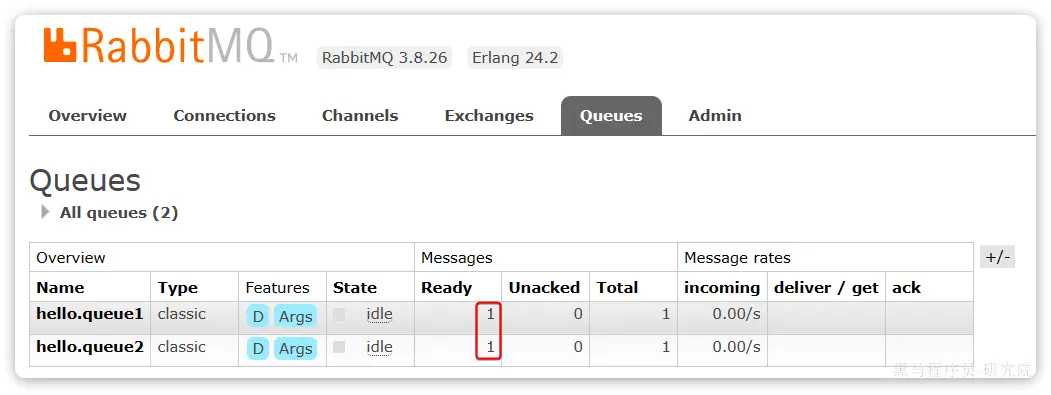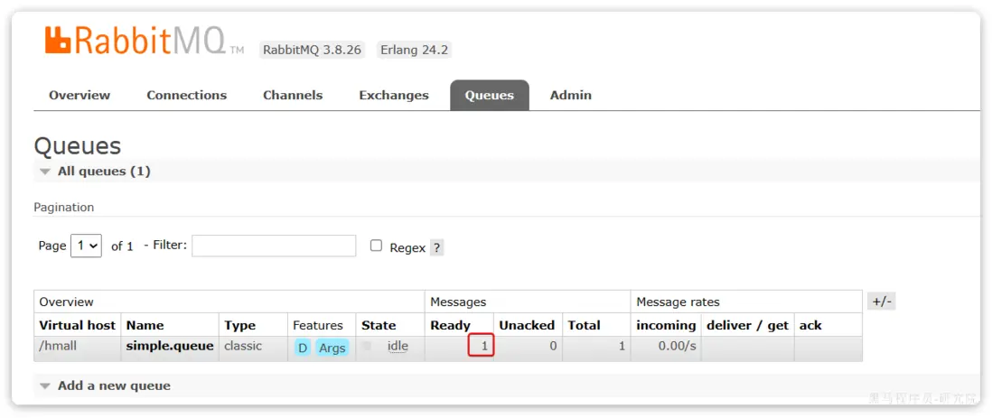 回到Queues頁面,可以發現hello.queue中已經有一條消息了: