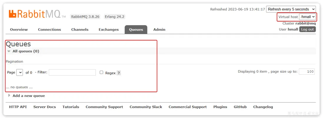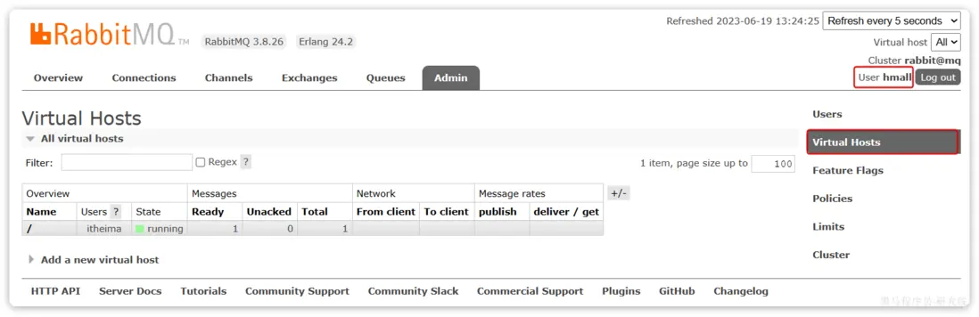 此時,點擊頁面右上角的virtual host下拉菜單,切換virtual host/hmall
