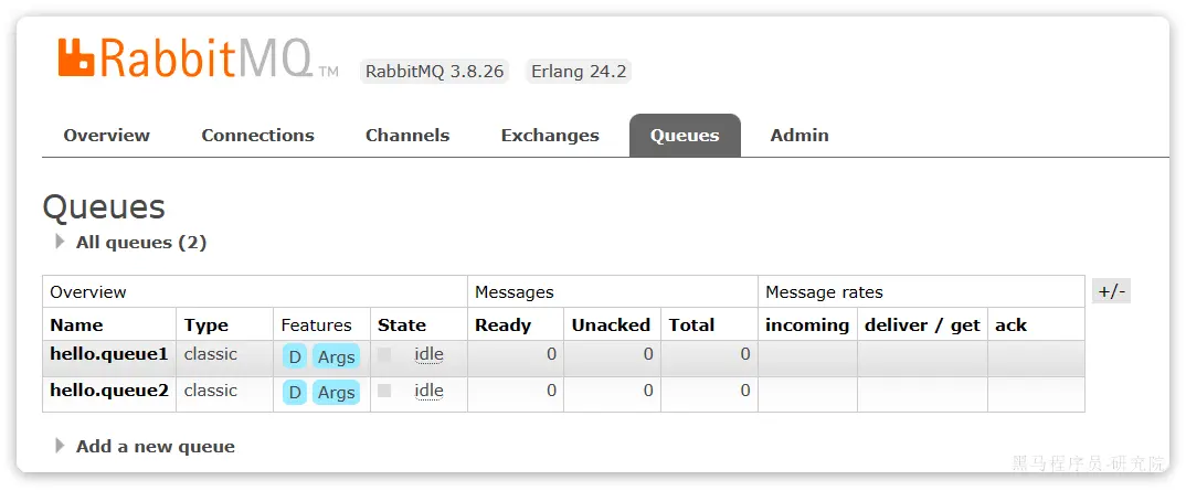 再以相同的方式,創建一個隊列,密碼為hello.queue2,最終隊列列表如下: