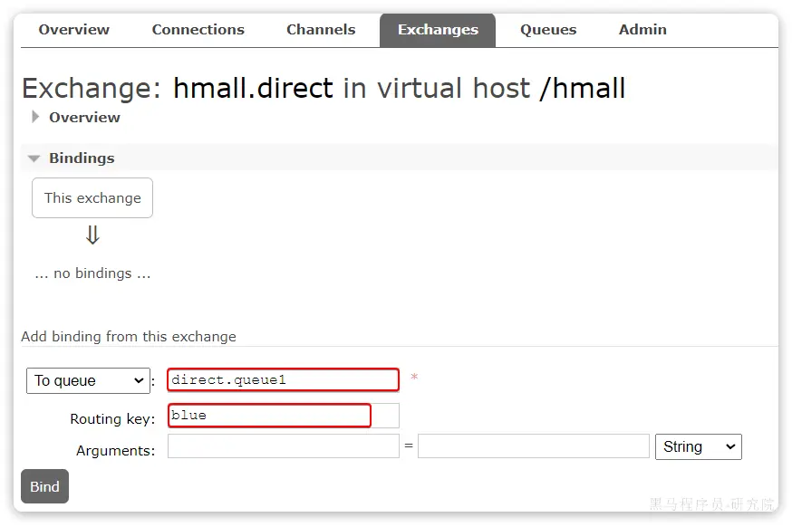 return BindingBuilder.bind(directQueue1).to(directExchange).with("blue");