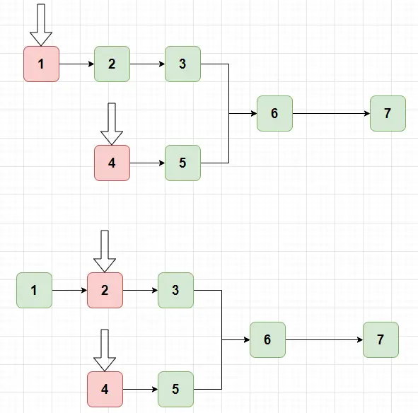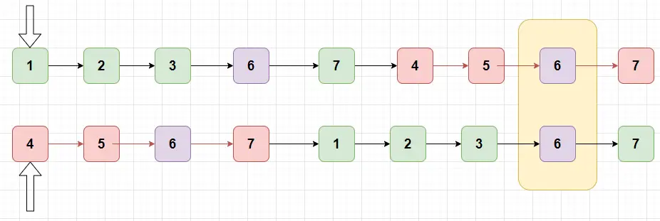 最直接的⽅法,每⼀個鏈表都遍歷⼀次,計算鏈表中的個數,⽐如 1->2->3->6->7 個數為5, 4->5-\>6->7 個數為4,兩者相差1(設為k)個。