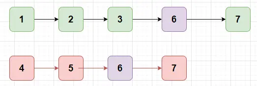 譬如現在有⼀個鏈表 1->2->3->6->7 ,另外⼀個鏈表 4->5->6->7 ,明顯可以看出第⼀個公共節點是6 。