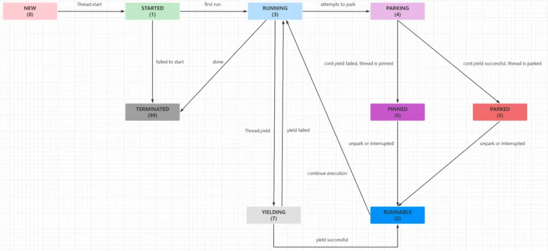 - 普通線程會阻塞在read本地方法調用上(底層應該就是read系統調用),而虛擬線程則會通過VirtualThread#park掛起,這也對應了上面説的,JDK中幾乎所有的阻塞點都已經過調整了。VirtualThread維護了一組state狀態,調用park後就會設置成PARKING,可以在註釋裏看到狀態之間的流轉邏輯。