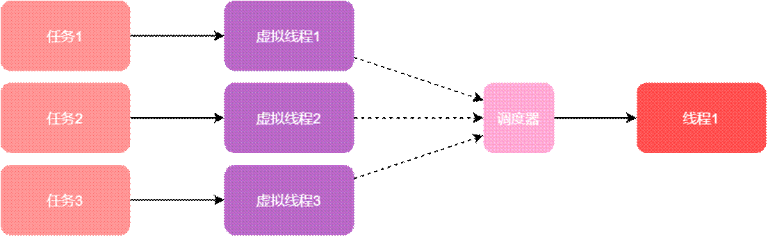 使用虛擬線程之後,任務-虛擬線程-調度器-平台線程的關係,1個平台線程可以被調度器分配不同的虛擬線程: