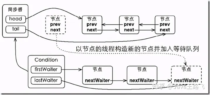 - 等待隊列分為首節點和尾節點。當一個線程調用Condition.await()方法,將會以當前線程構造節點,並將節點從尾部加入等待隊列。