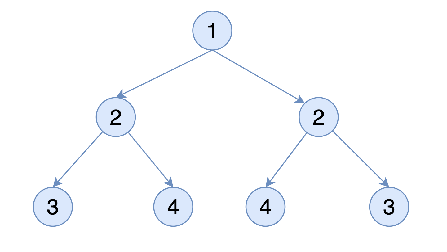 如果左右⼦樹都為空,則返回 true ,如果有⼀個為空,則返回 false ,如果兩個都不為空的時候,除了對⽐左右兩個節點的值,還需要遞歸,對⽐左⼦樹的左⼦樹和右⼦樹的右⼦樹是否相等,左⼦樹的右⼦樹和右⼦樹的左⼦樹是否相等。