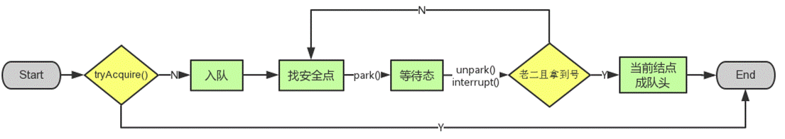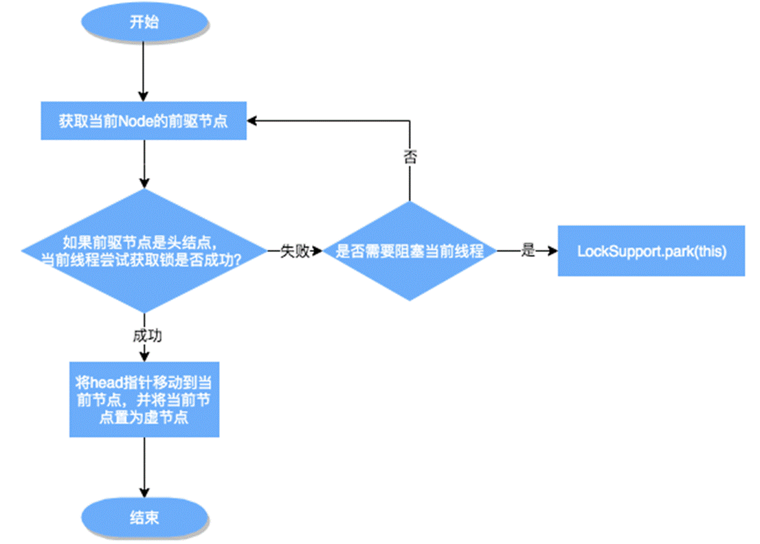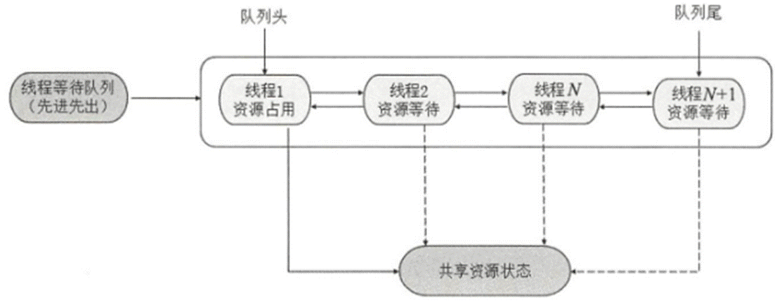 AQS 為每個共享資源都設置一個共享資源鎖,線程在需要訪問共享資源時首先需要獲取共享資源鎖,如果獲取到了共享資源鎖,便可以在當前線程中使用該共享資源,如果獲取不到,則將該線程放入線程等待隊列,等待下一次資源調度,流程圖如下所示: