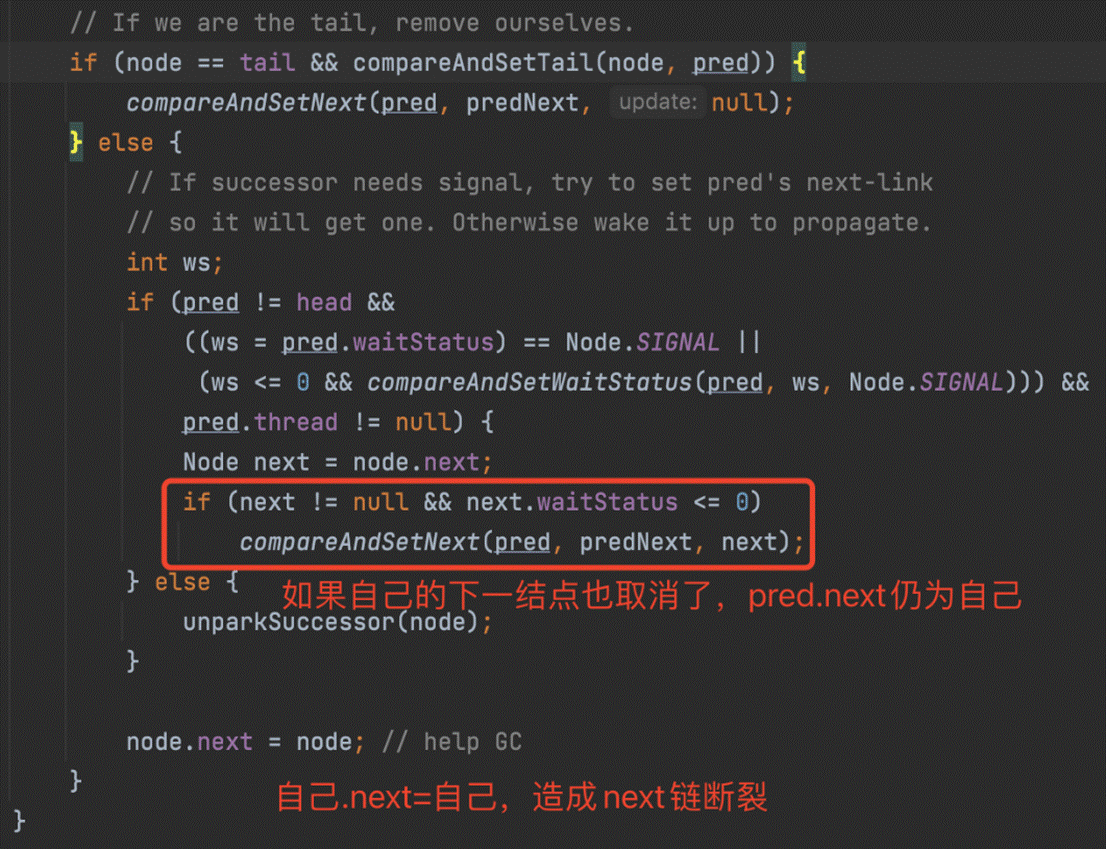 跟獨佔模式比,還有一點需要注意的是,這裏只有線程是head.next時(“老二”),才會去嘗試獲取資源,有剩餘的話還會喚醒之後的隊友。
