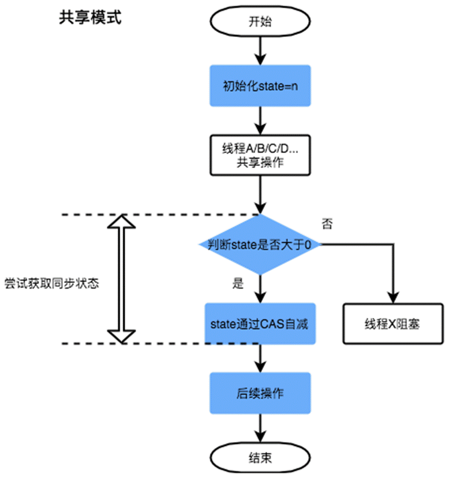 共享式:多個線程可同時執行,具體的 Java 實現有 Semaphore和CountDownLatch。
