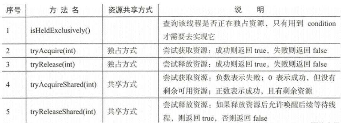 AQS只是一個框架 ,只定義了一個接口,具體資源的獲取、釋放都由自定義同步器去實現。不同的自定義同步器爭用共享資源的方式也不同,自定義同步器在實現時只需實現共享資源state的獲取與釋放方式即可,至於具體線程等待隊列的維護,如獲取資源失敗入隊、喚醒出隊等, AQS 已經在頂層實現好(就是模板方法模式),不需要具體的同步器再做處理。自定義同步器實現時主要實現以下幾種方法: