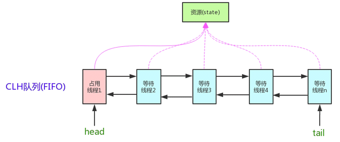Craig、Landin and Hagersten隊列,是單向鏈表,AQS中的隊列是CLH變體的虛擬雙向隊列(FIFO),AQS是通過將每條請求共享資源的線程封裝成一個節點來實現鎖的分配。