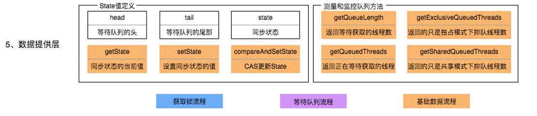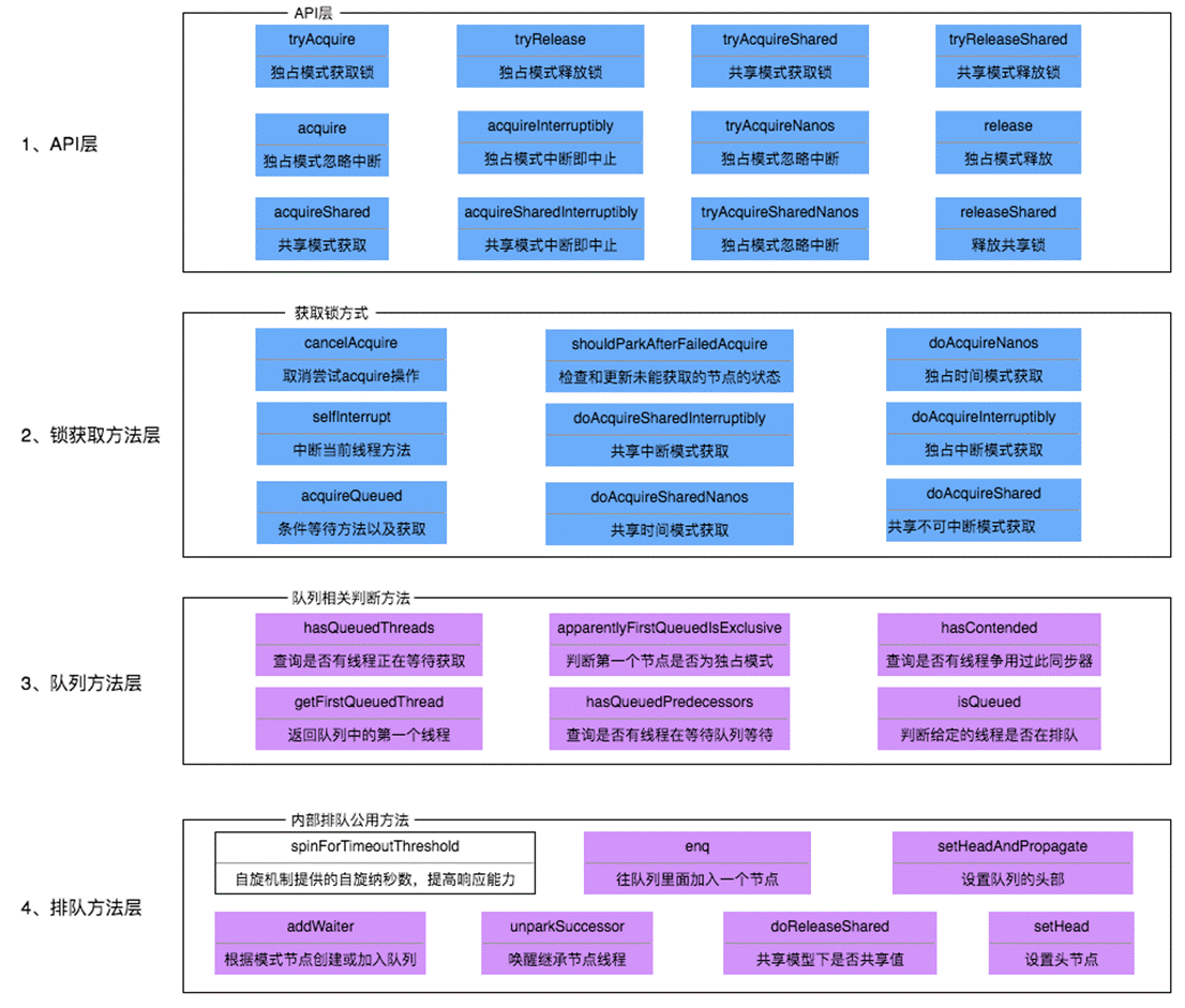 當有自定義同步器接入時,只需重寫第一層所需要的部分方法即可,不需要關注底層具體的實現流程。當自定義同步器進行加鎖或者解鎖操作時,先經過第一層的API進入AQS內部方法,然後經過第二層進行鎖的獲取,接着對於獲取鎖失敗的流程,進入第三層和第四層的等待隊列處理,而這些處理方式均依賴於第五層的基礎數據提供層