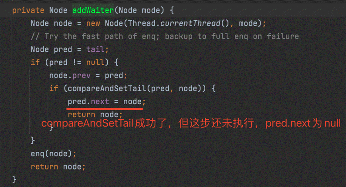 - addWaiter()將該線程加入等待隊列的尾部,並標記為獨佔模式;