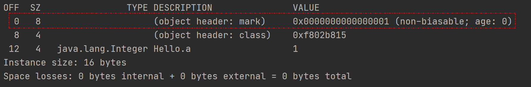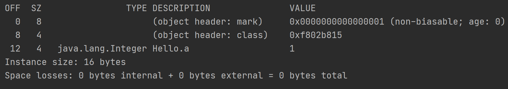 System.out.printf(ClassLayout.parseInstance(a).toPrintable());