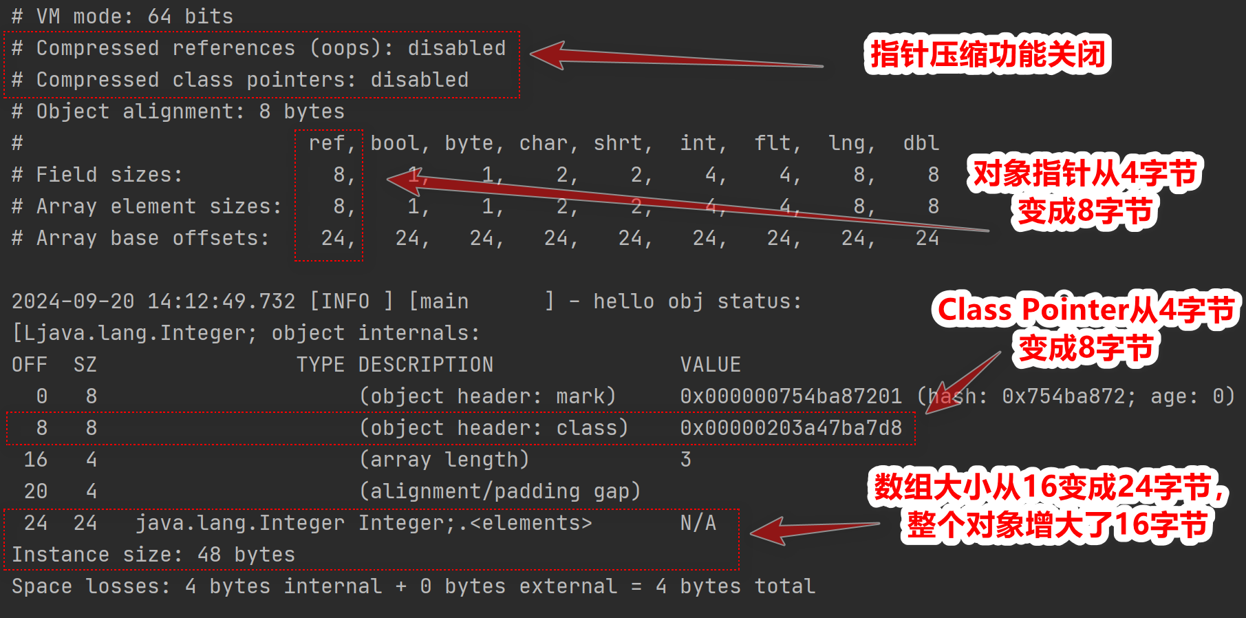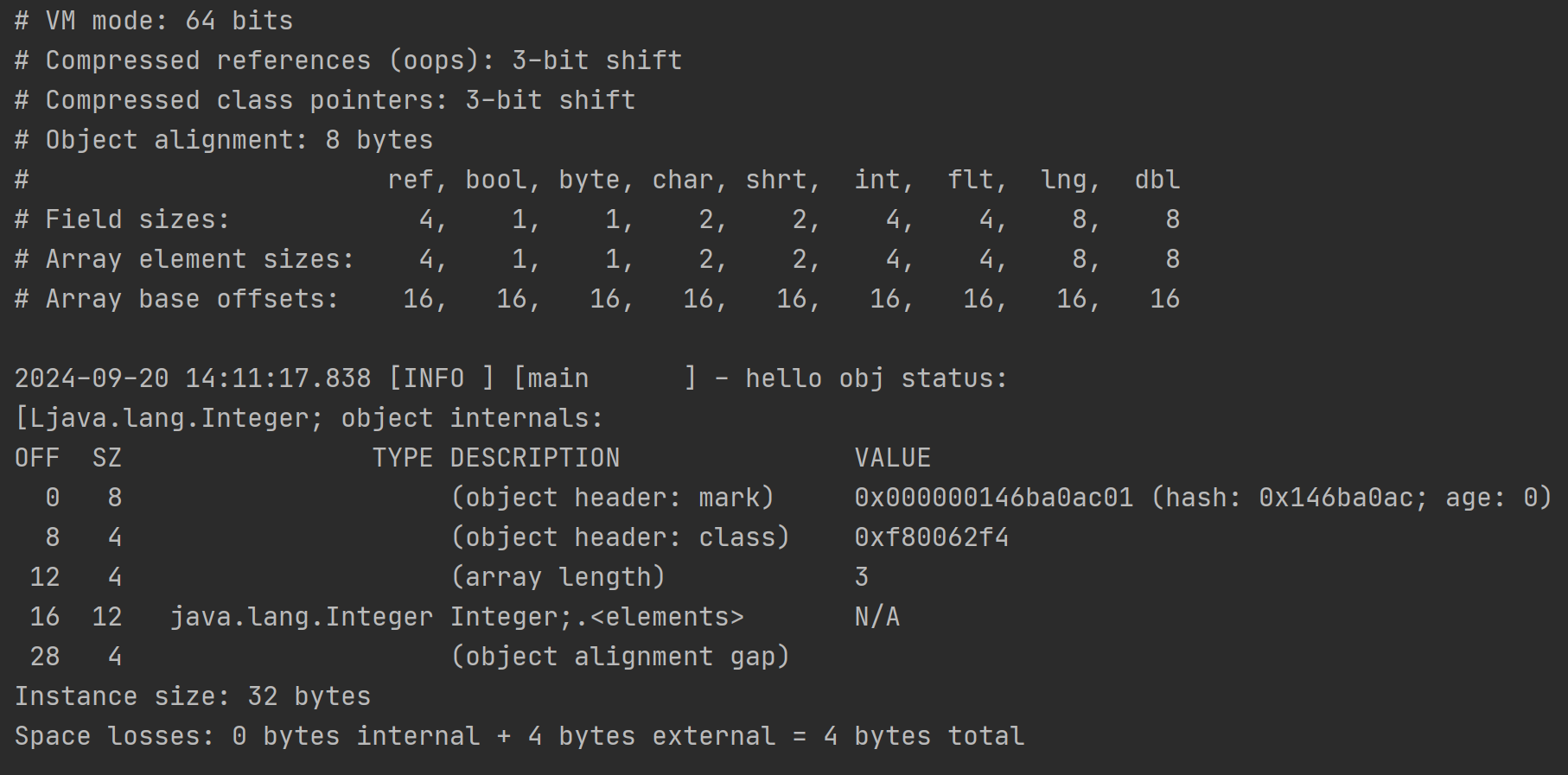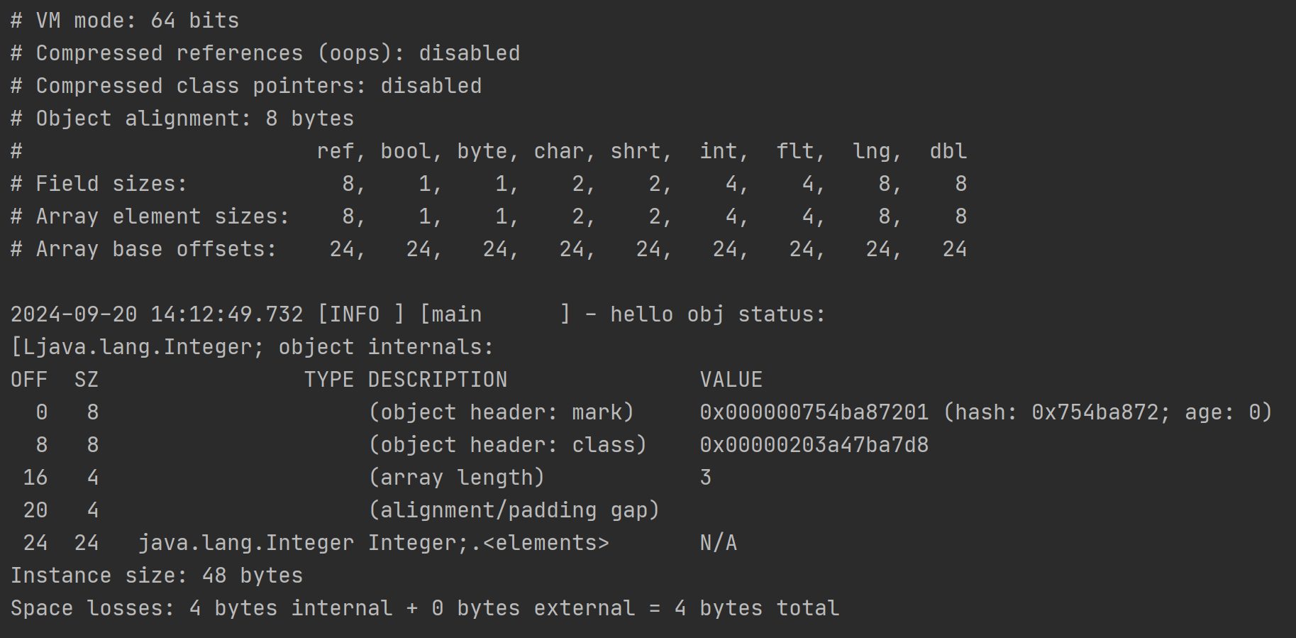 需要注意的是這裏的Integer[]數組裏面都是Integer對象,而非int類型的數值,它是Integer基本類型包裝類的實例,這裏的數組內存地址中存儲的是每個Integer對象的指針引用,從輸出的VM信息的對照表中,“ref”類型佔據8字節,所以才是3*8為24字節大小。