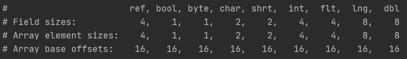 這部分輸出表示 引用類型、boolean、byte、char、short、int、float、long、doubl e類型的數據所佔的字節數大小以及在數組中的大小和偏移量。