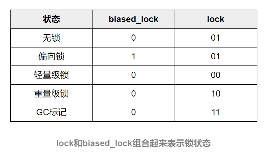 biased_lock:對象是否啓用偏向鎖標記,只佔1個二進制位。為1時表示對象啓用偏向鎖,為0時表示對象沒有偏向鎖。lock和biased_lock兩個標記位組合在一起共同表示Object實例處於什麼樣的鎖狀態。二者組合的含義具體如下表所示