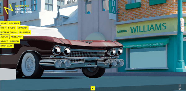 Norwich University of the Arts The strong photography and beautiful images do a great job of showcasing the artistic talent at this university right from the start. The background image on the home page tells a story, drawing the user in. I like the layout of the navigation to the side; it is different but works well and doesn’t overpower the image or layout. The labels are all yellow, creating a consistent visual identity. The drop-down menus take prominence when a category is clicked, which the layout accommodates well.