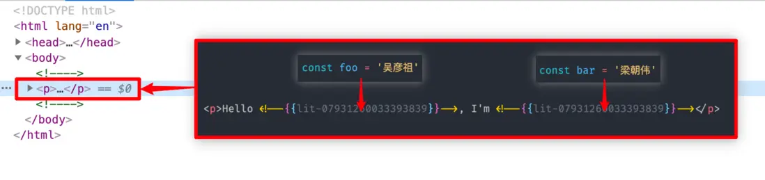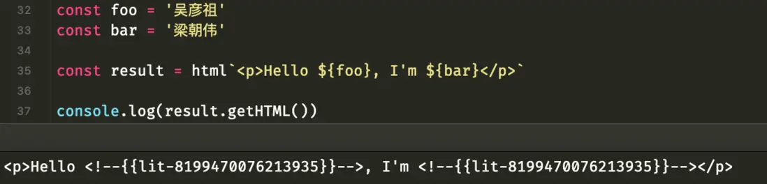 實例化的 TemplateResult 會提供一個 getTemplateElement 方法,該方法會創建一個 template 標籤,然後會將 getHTML 的值傳入 template 標籤的 innerHTML 中。而 getHTML 方法的作用,就是在之前傳入的靜態字符串中間插入 HTML 註釋。前面的案例中,如果調用 getHTML 得到的結果如下。