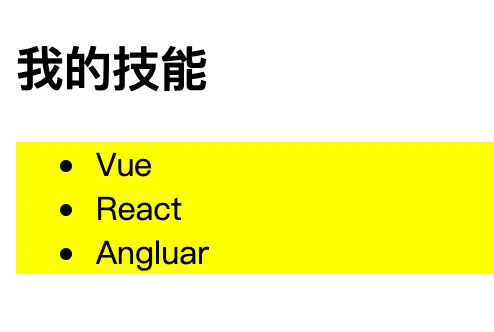 skillTpl('我的技能', ['Vue', 'React', 'Angluar'], true),