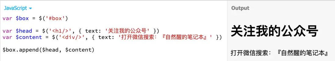 var $head = $('<h1/>', { text: '關注我的公眾號' })