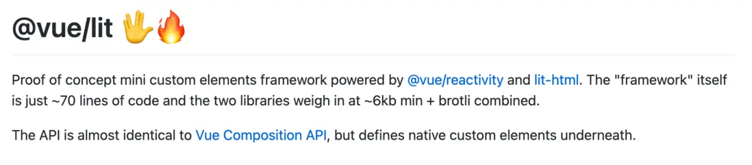 除了官方的 lit-element 框架,Vue 的作者還將 Vue 的響應式部分剝離,與 lit-html 進行了結合,創建了一個 vue-lit(https://github.com/yyx990803/vue-lit) 的框架,一共也就寫了 70 行代碼,感興趣可以看看。