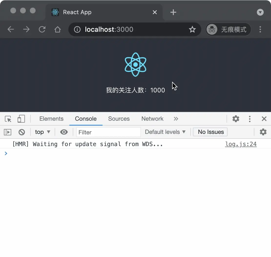 上面的 React Logo 綁定了一個點擊事件,現在需要實現這個點擊事件,在點擊 Logo 之後,進行一次 setState 操作,在 set 操作完成時打印一個 log,並且在 set 操作之前,分別添加一個宏任務和微任務。代碼如下: