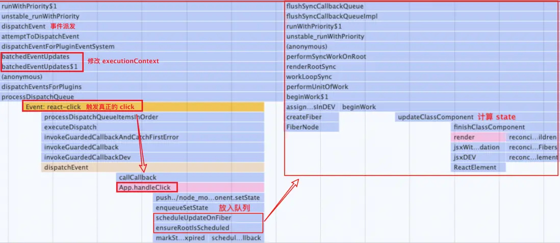 所有的事件在觸發的時候,都會先調用 batchedEventUpdates$1 這個方法,在這裏就會修改 executionContext 的值,React 就知道此時的 setState 在自己的掌控中。