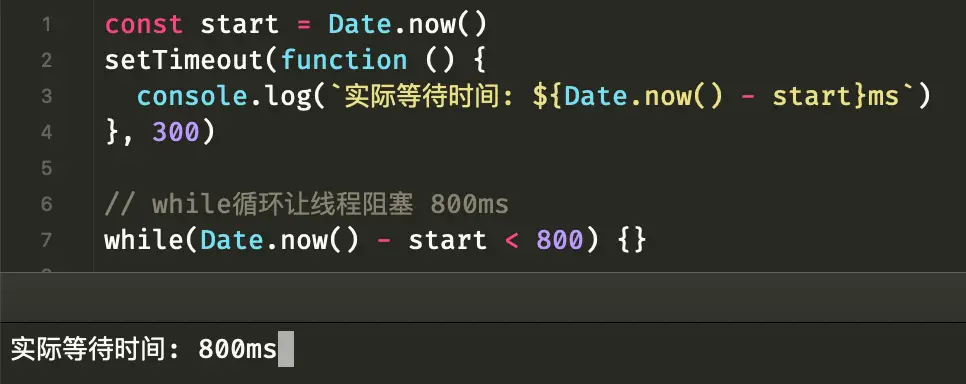 但是我們在還沒加了一個 while 循環,這個循環會在 800ms 後才結束,主線程一直被這個循環阻塞在這裏,導致時間到了回調函數也沒有正常運行。