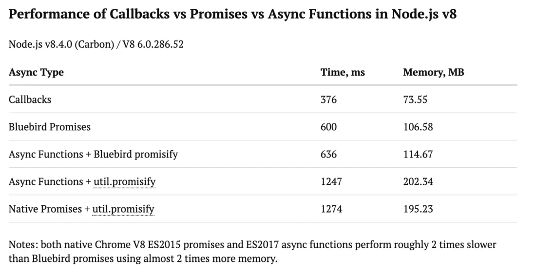 在 Node.js@8 之前,V8 原生的 Promise 實現有一些性能問題,導致原生 Promise 的性能甚至不如一些第三方的 Promise 庫。