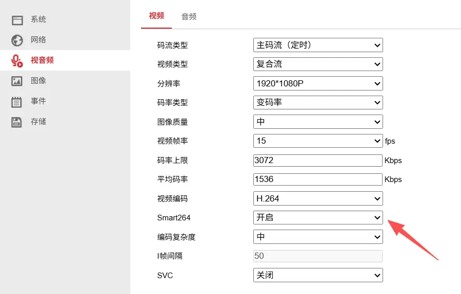 注意在攝像頭的配置中,將攝像頭的 H.264 編碼參數調優為 SmartH264,可以讓攝像頭在畫面靜止時降低碼率(在畫面不怎麼動的情況下可以最大降低 90% 碼流),減少網絡帶寬佔用,同時在畫面有變化時提升碼率和幀率,保證畫面質量。這樣在多路併發時,可以顯著降低整體的網絡和解碼壓力。