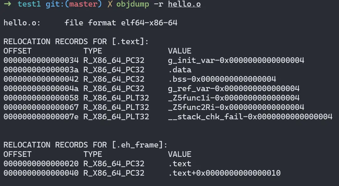 前面 readelf -S 結果中的 .rela.text 就是重定位表,它包含了代碼段的重定位條目,記錄需要調整的外部符號引用,比如 hello.cpp 中調用的 func2,在編譯時其實是不知道具體地址的,此時在這個重定位表中就會記下這個符號和其所在的相對偏移,後續在鏈接的重定位階段才會知道 func2 的真正地址,再根據重定位表找到之前的符號並回填為真正地址。