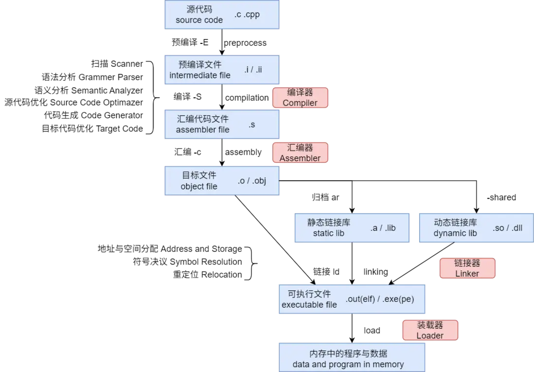 這三個階段環環相扣,使得編譯器生成的、各自獨立的目標文件能夠正確地合併為一個可執行文件 .out 或動態鏈接庫 .so。