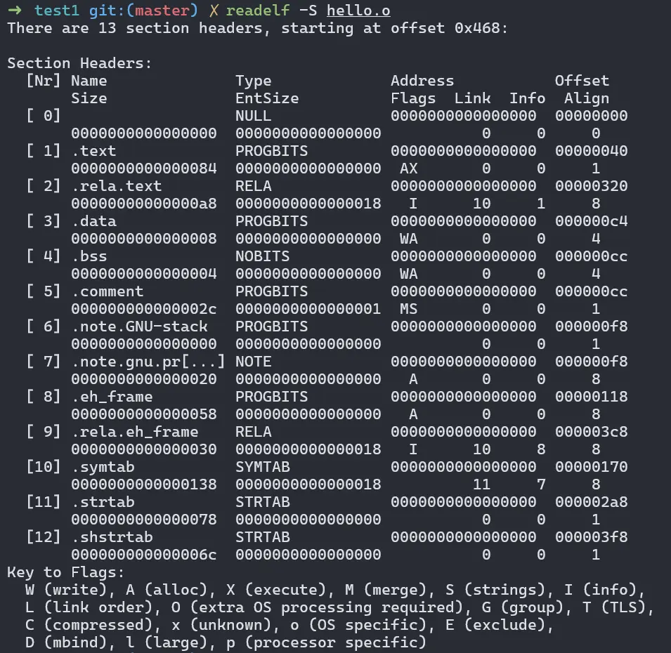 從上述的結果我們可以看出 hello.o 一共有 8 個段,分別是: