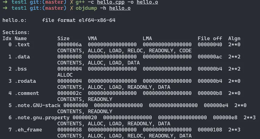 此時生成的目標文件,可以使用 objdump -h 查看其中的段(Windows 上可以用 MSVC 的 dumpbin /headers 查看):
