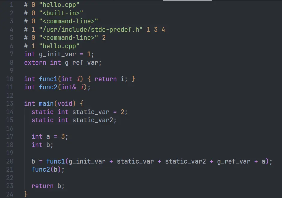 這裏 -E 表示只進行預編譯,生成的 .ii 預編譯文件打開是這樣的,註釋被移除了: