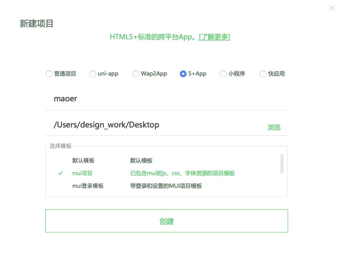 打開HBuilder,在菜單欄中選擇文件——新建——項目,選擇5+App,創建一個mui項目,填寫文件名稱、保存位置,點擊創建,會給你生成一個包含mui的js、css、字體資源的項目模版。