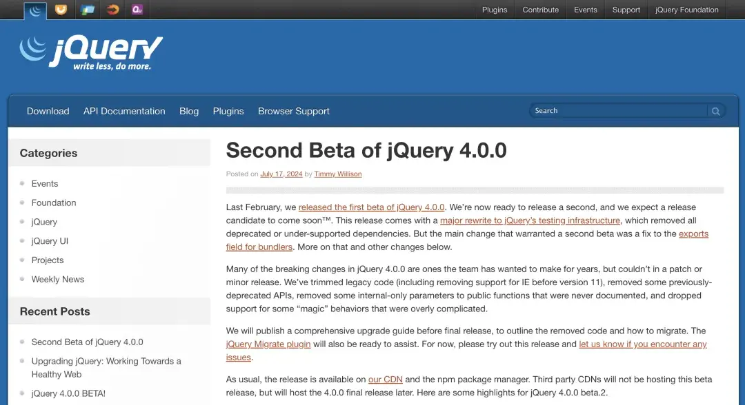 而現在,即便在 React、Vue 這樣的現代框架盛行的今天,或者AI都滿天飛的今天jQuery 仍在更新,你覺得神奇不神奇?根據官方在最近的2024年7月17日博客《Second Beta of jQuery 4.0.0》中發佈的消息,jQuery 4.0.0 的第二個測試版已經推出。這一版本不僅修復了眾多已知問題,提高了性能,還加入了一些響應現代網頁需求的新特性。例如,它現在提供了更強大的選擇器和更精細的錯誤處理機制,以及對現代 JavaScript 特性的支持,顯示了它適應時代變遷的能力。