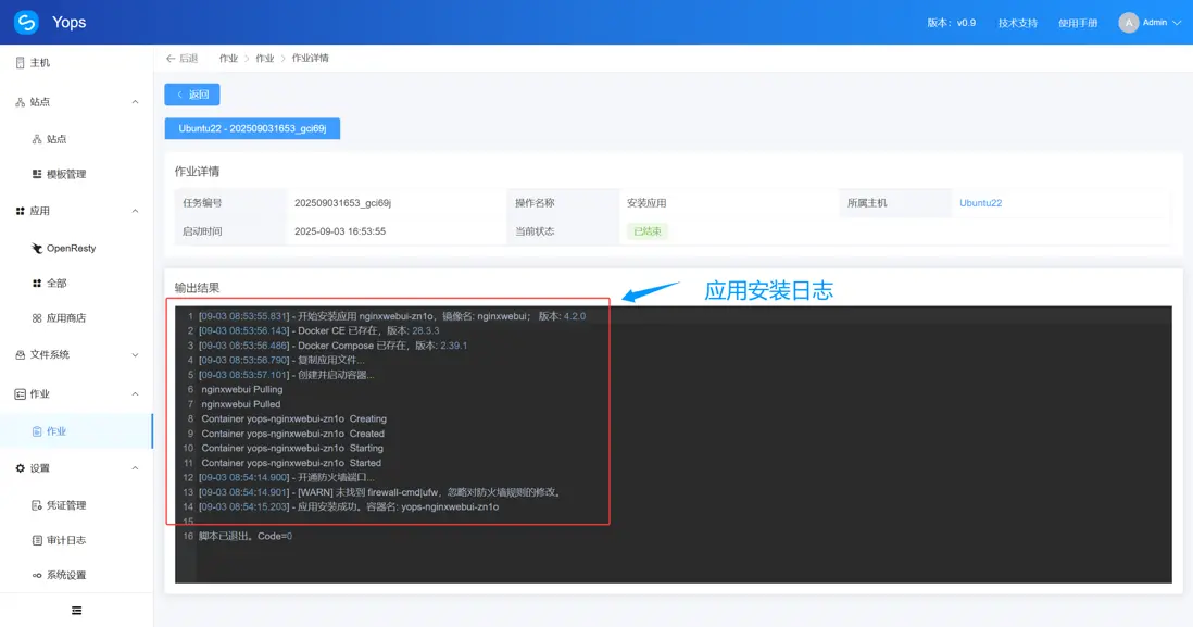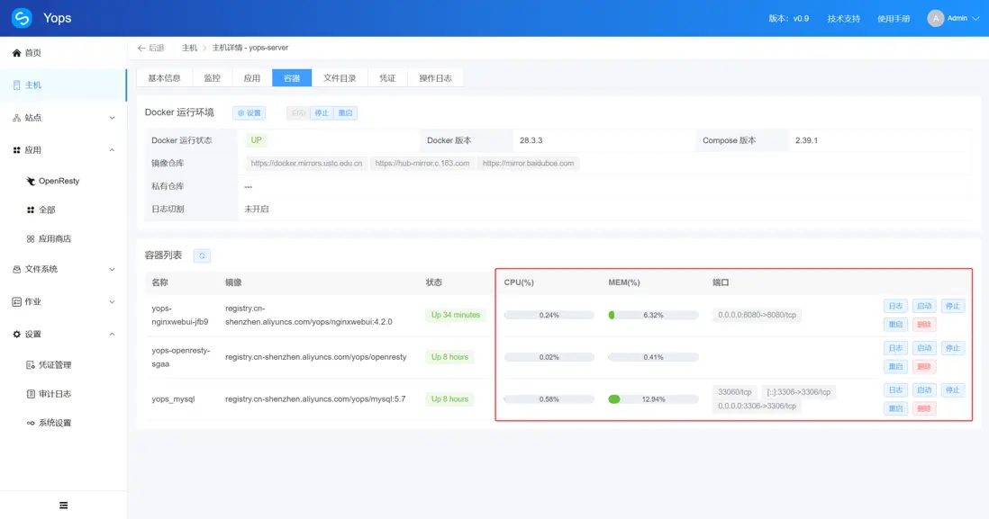 Yops 運維面板通過 單主機維度應用維度 的容器管理,輔以審計日誌與作業模塊,提供了全流程的可視化解決方案: