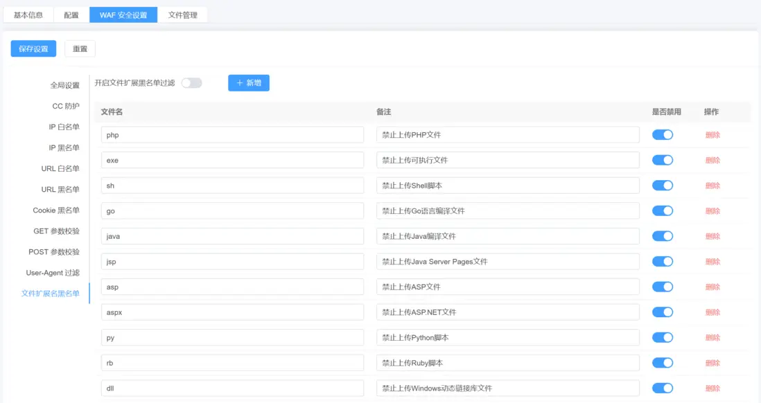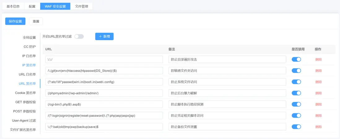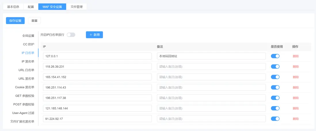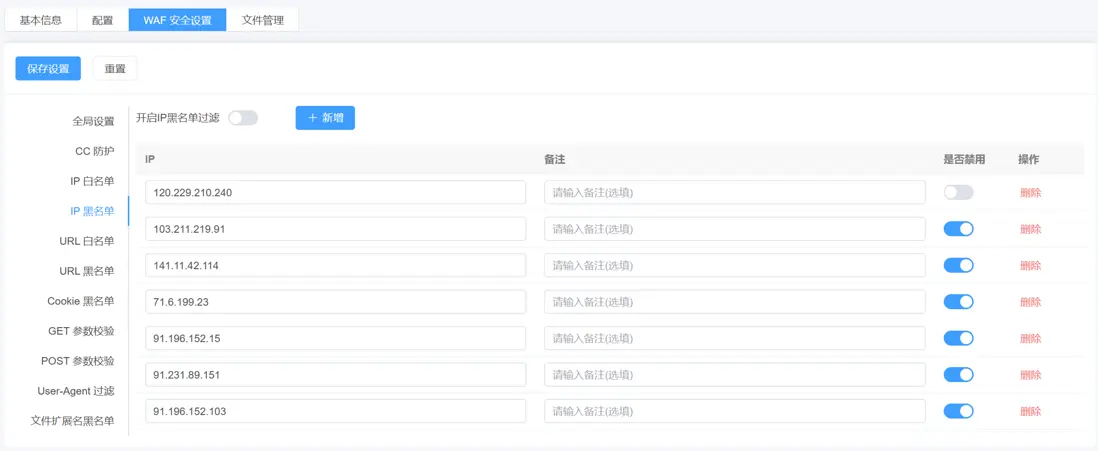 IP黑白名單: 控制指定 IP 是否可訪問網站,黑名單阻斷攻擊來源,白名單保障可信用户正常訪問。