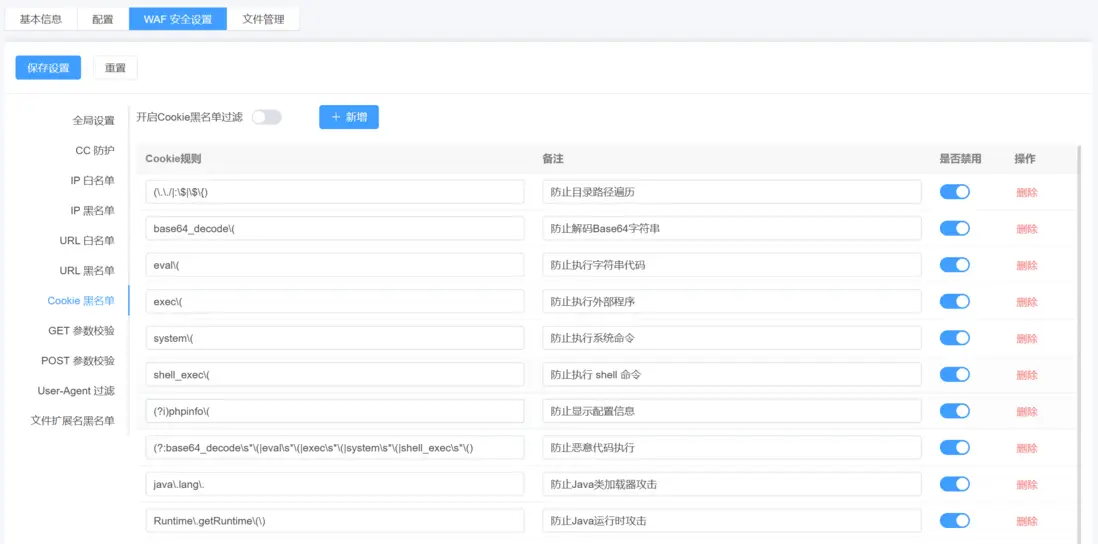 Cookie 黑名單: 檢測並攔截異常或偽造的 Cookie,防止會話劫持、偽造身份等攻擊。
