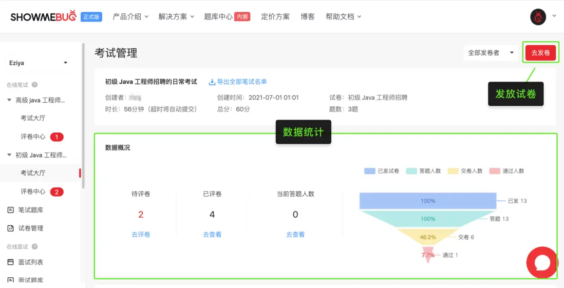 ShowMeBug 大更新! 一口氣上線了多個針對筆試的實用功能,收集考試信息、設定筆試開考時間、大批量發放試卷、數據統計等。登陸後的“考試管理”頁面也不一樣啦!增加了數據漏斗圖,讓 HR 能更直觀清晰的瞭解到筆試的數據情況,助力 HR 高效篩選海量候選人。歡迎登陸我們平台免費試用: https://www.showmebug.com