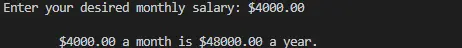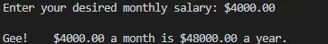 printf("\n\t$%.2f a month is $%.2f a year.", salary, salary * 12.0);