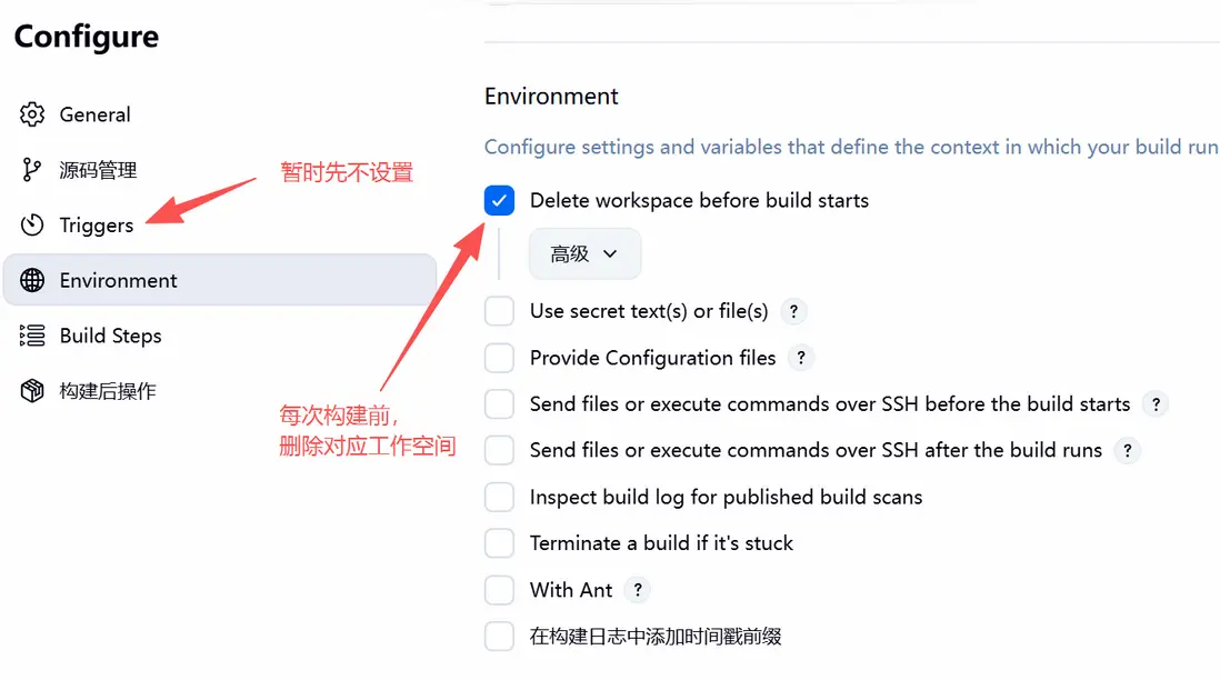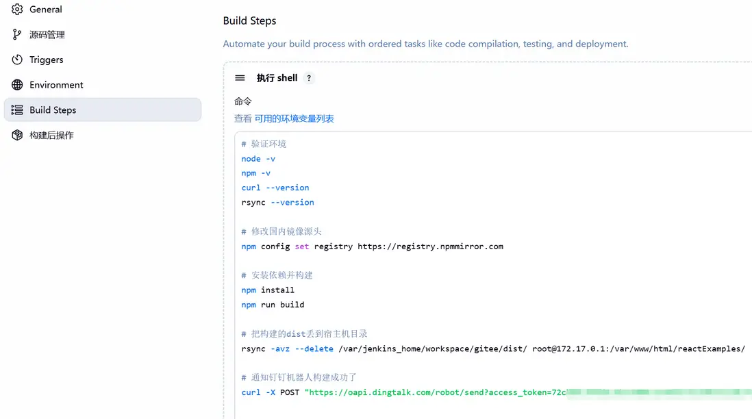 接下來,我們在jenkins創建一個項目(做相應配置),採取手動觸發的方式(點一下),讓jenkins拉取gitee倉庫的代碼,並通過編寫的shell腳本,構建dist產物,最後通過rsync把產物傳輸的生產目錄,再接入釘釘機器人告知構建成功