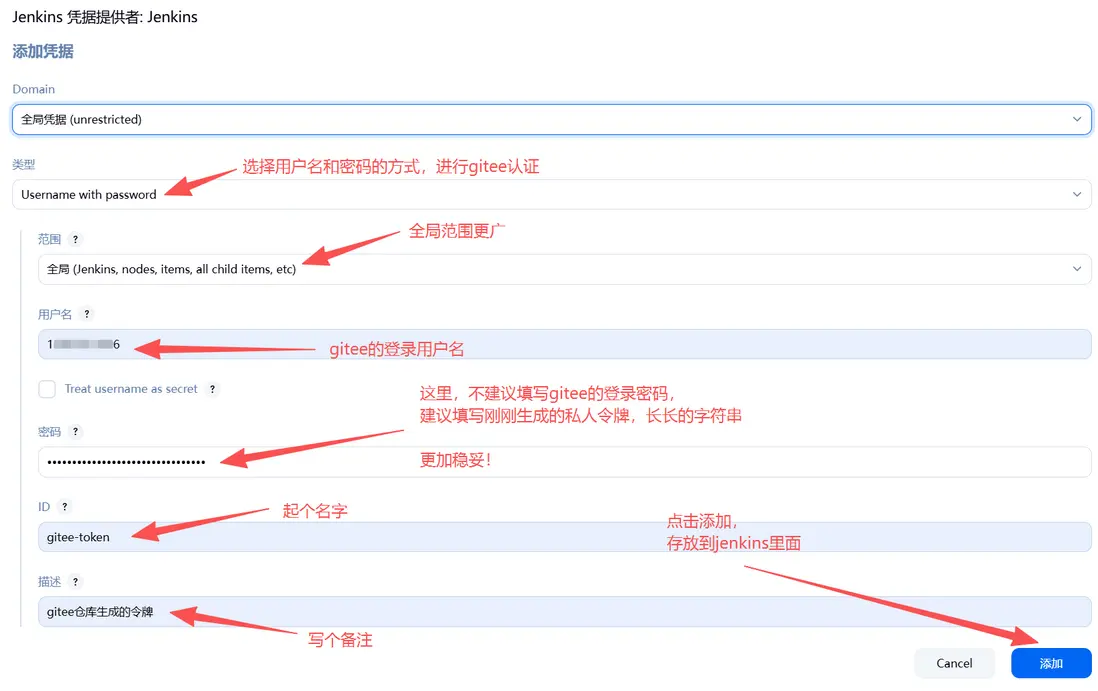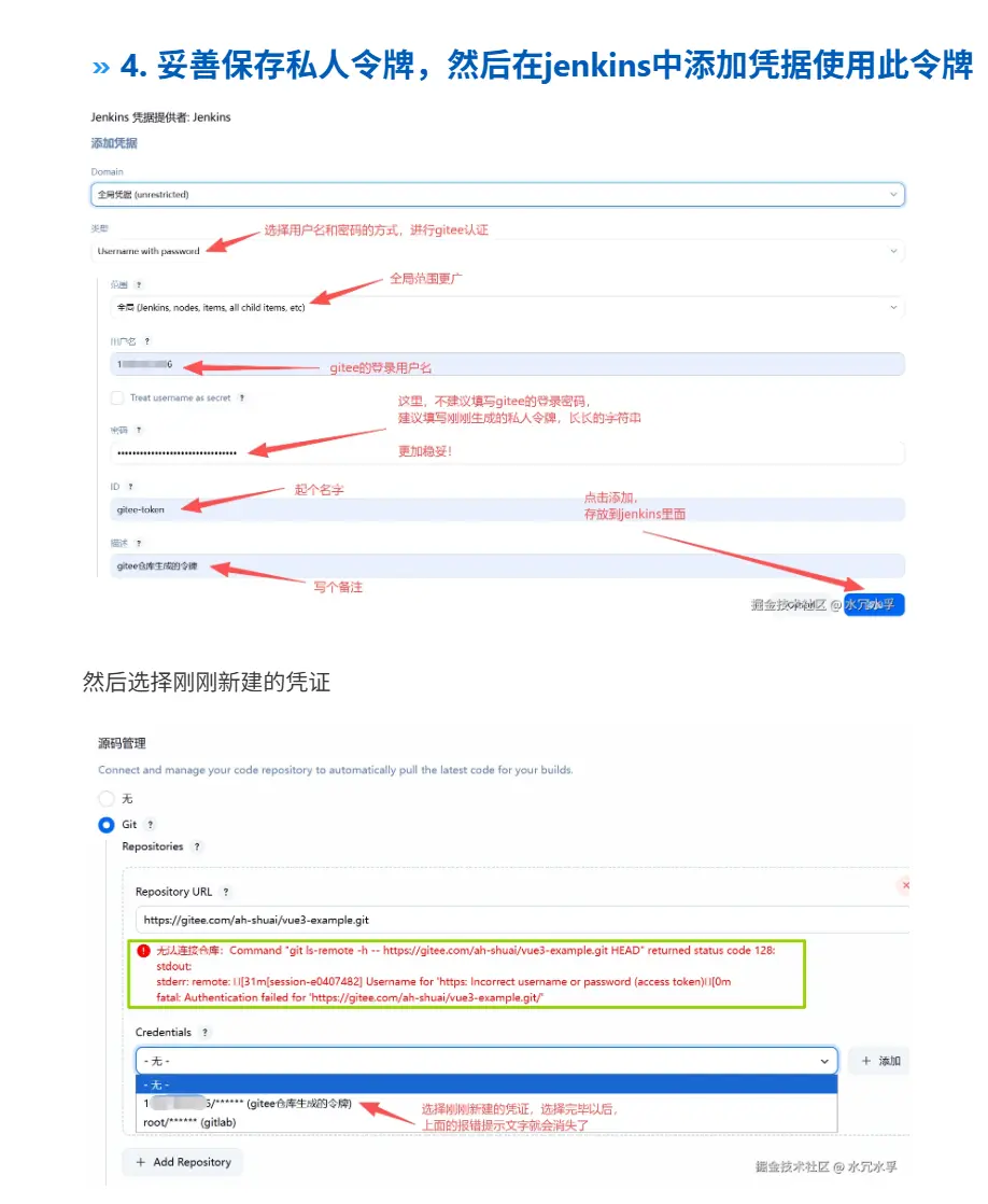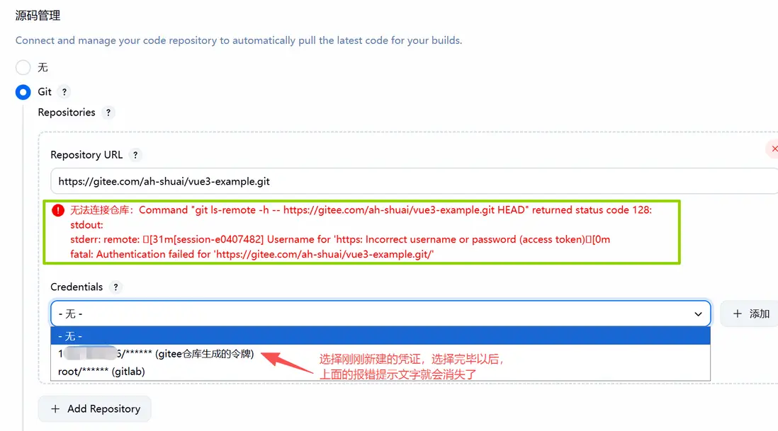 選擇git,填寫gitee倉庫,並準備新建憑證,並使用這個憑證