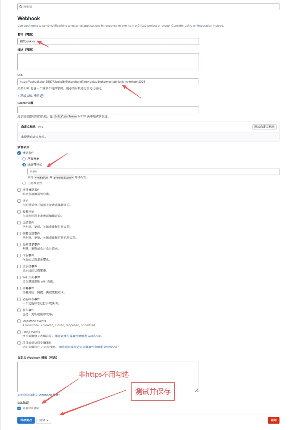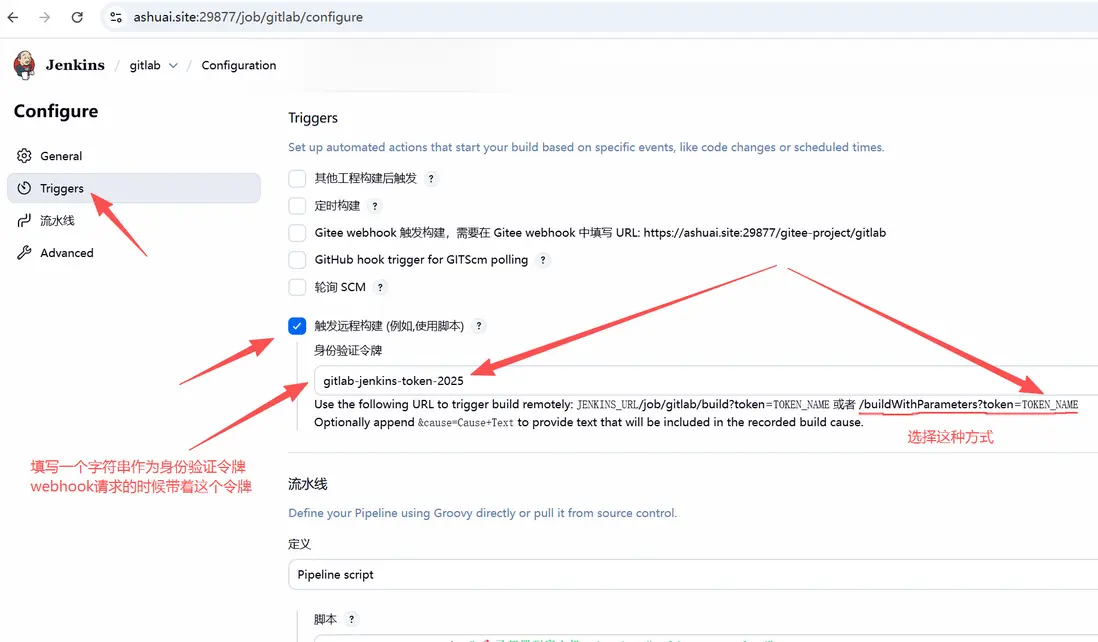 https://ashuai.site:29877/buildByToken/build?job=gitlab&token=gitlab-jenkins-token-2025- 使用/buildByToken/build這種方式,一定要搭配Build Authorization Token Root Plugin插件