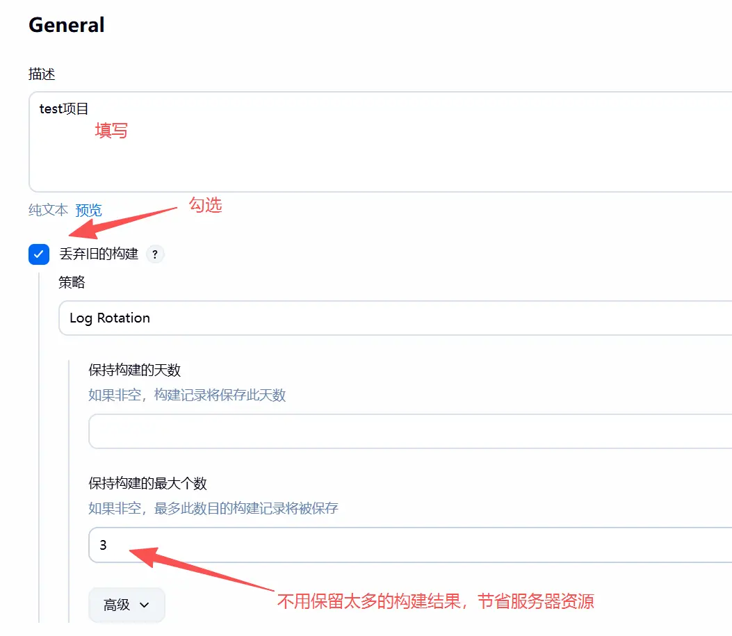 然後填寫項目描述,丟棄舊的構建,只保留三個歷史構建結果